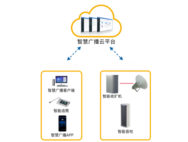 智慧廣播系統由智慧廣播云平臺、傳輸網絡和智慧廣播前端、終端組成,通過4G或IP網絡傳輸信號,具有安裝快捷,系統穩定,使用方便,秒級發布等特點。